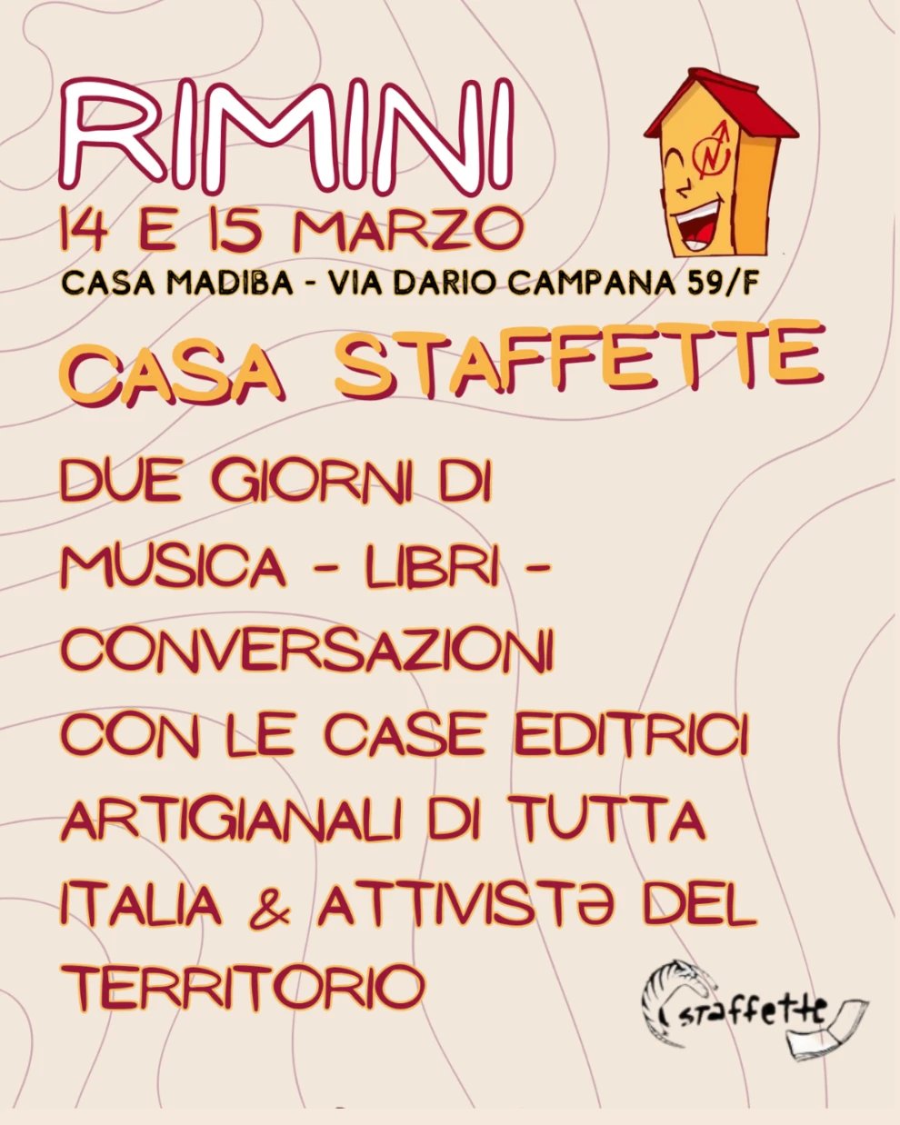 Sabato 14 e domenica 15 marzo lo spazio sociale riminese Casa Madiba ospiterà il festival itinerante del libro indipendente Staffette. Saranno 2 giorni di dibattiti, musica, idee e attività per grandi e piccini.