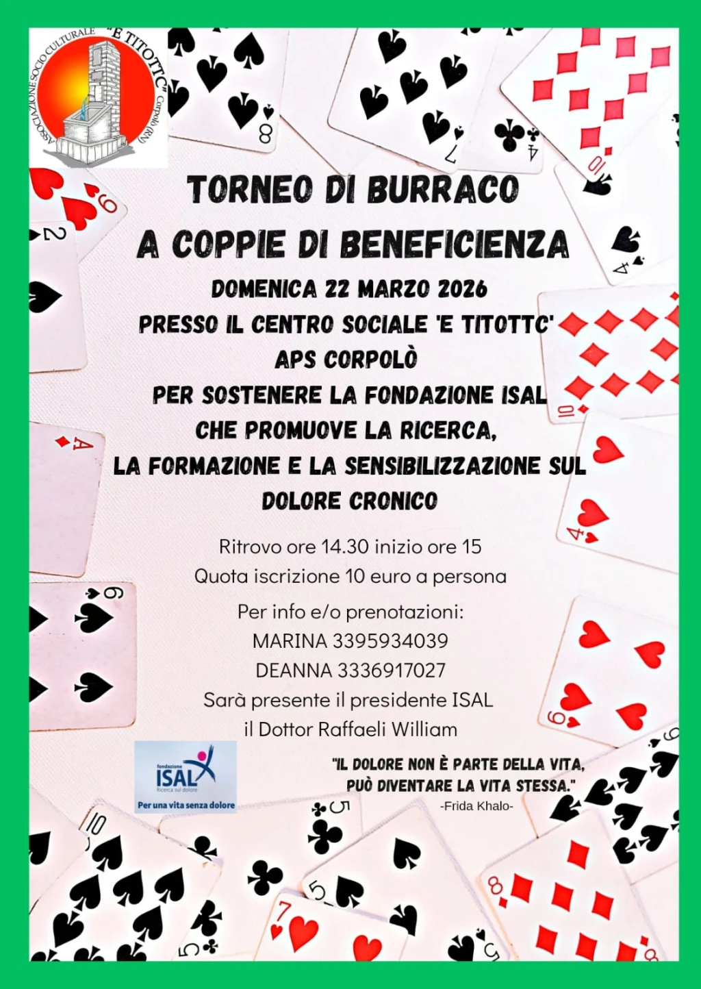 L’appuntamento è fissato per il primo pomeriggio. I partecipanti si ritroveranno alle 14.30, mentre l’inizio del torneo è previsto per le 15. Il contributo di partecipazione è di 10 euro a persona, una quota simbolica che permetterà di sostenere concretamente le attività della Fondazione ISAL, realtà scientifica e culturale impegnata da oltre trent’anni nello studio e nella cura del dolore cronico.