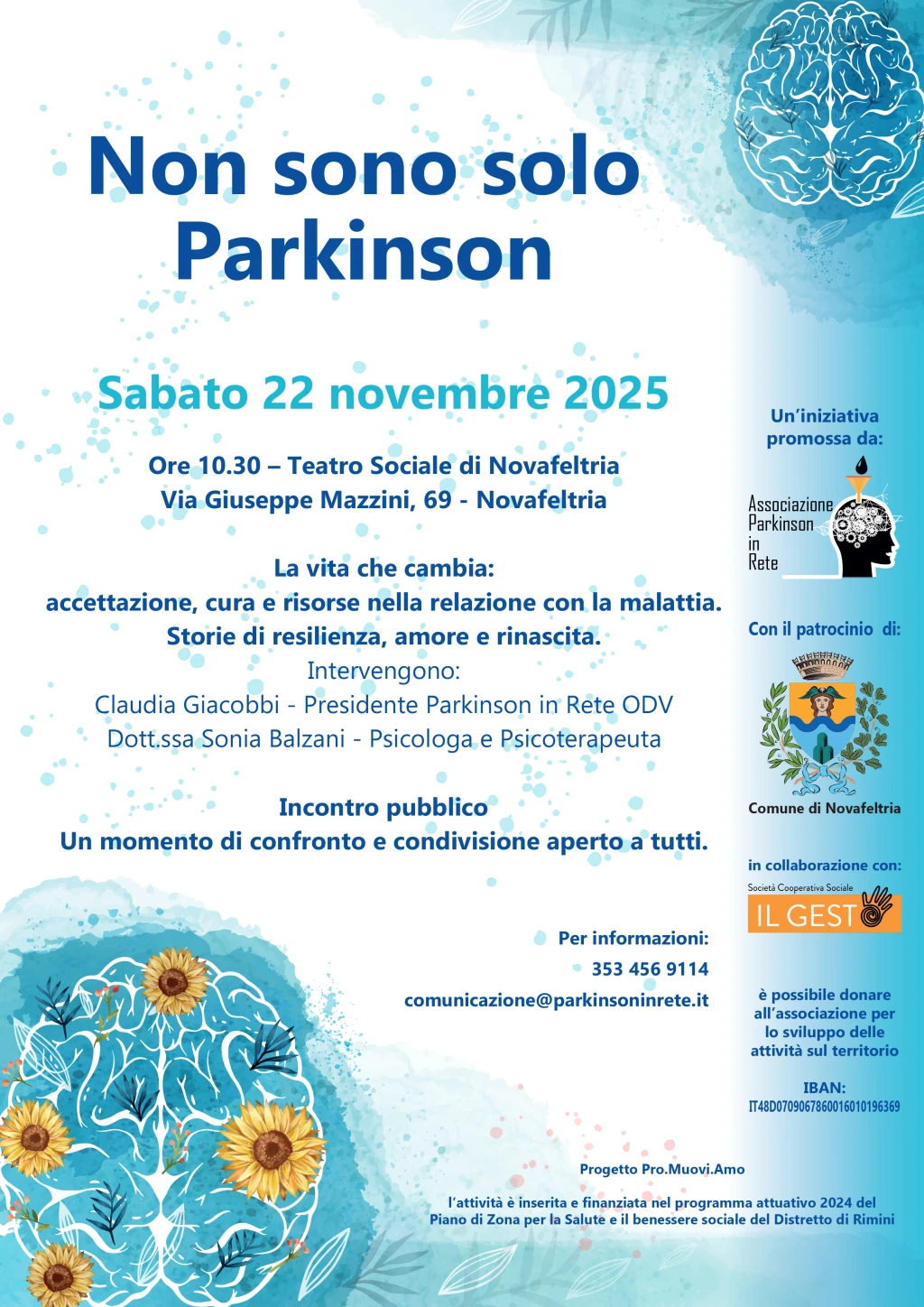 In occasione della Giornata nazionale Parkinson, sono in programma anche altre iniziative di approfondimento e sensibilizzazione nei Comuni della provincia, per promuovere la partecipazione e rafforzare la rete territoriale di sostegno alle persone affette dalla malattia e alle loro famiglie. Venerdì 22 novembre, alle 10:30, si terrà un incontro pubblico al Teatro sociale di Novafeltria (via Giuseppe Mazzini, 69) dal titolo “La vita che cambia: accettazione, cura e risorse nella relazione con la malattia. Storie di resilienza, amore e rinascita”. Lo stesso incontro verrà replicato venerdì 29 novembre alle 10:30 presso la Sala del Consiglio comunale di Bellaria Igea Marina (piazza del Popolo, 1).