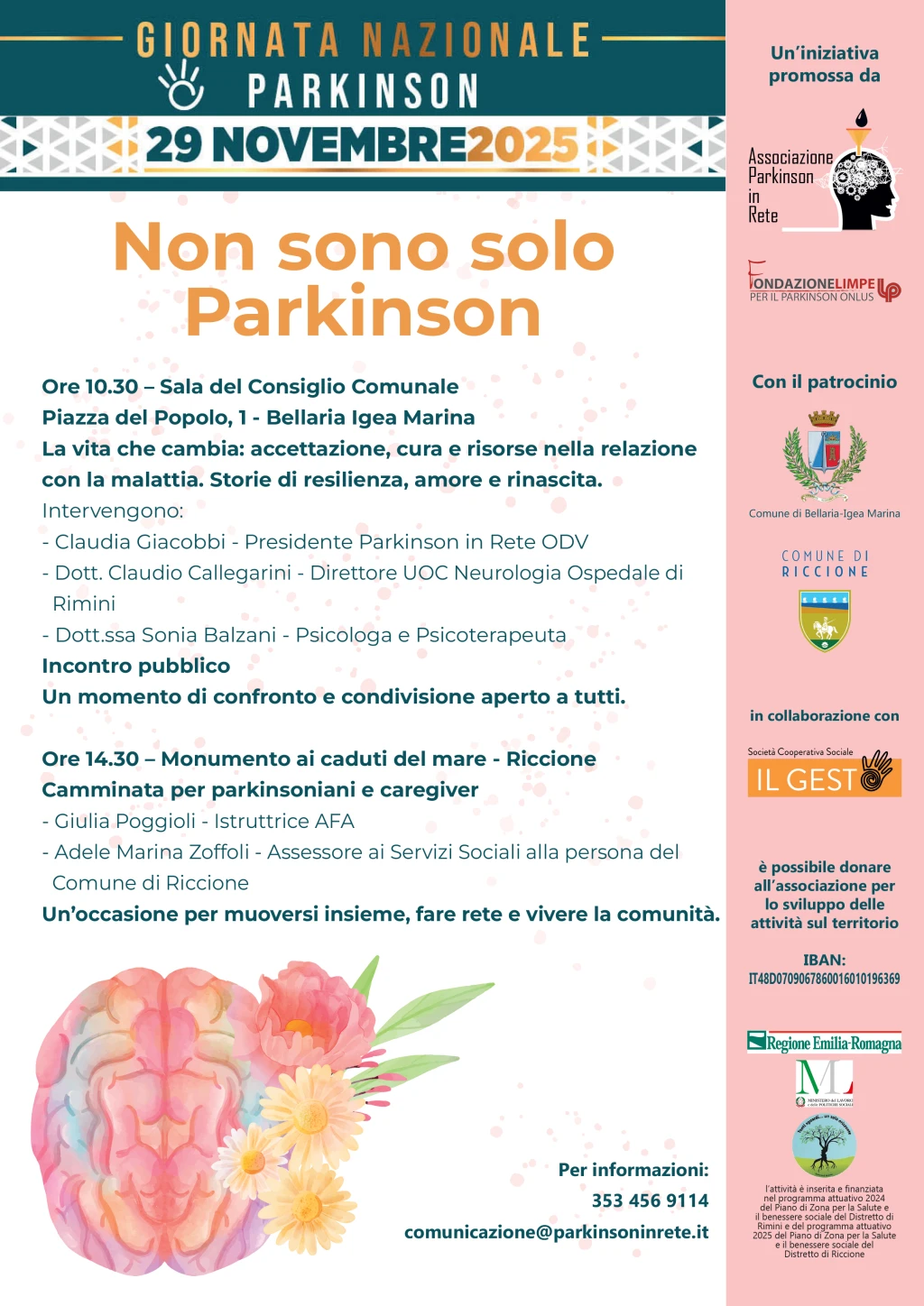 Le iniziative per la Giornata nazionale Parkinson sono promosse dall’associazione Parkinson in Rete e inserite nei programmi attuativi 2024 del Piano di Zona per la Salute e il Benessere Sociale del Distretto di Rimini e 2025 del Distretto di Riccione, con il patrocinio e il sostegno dei rispettivi enti locali.