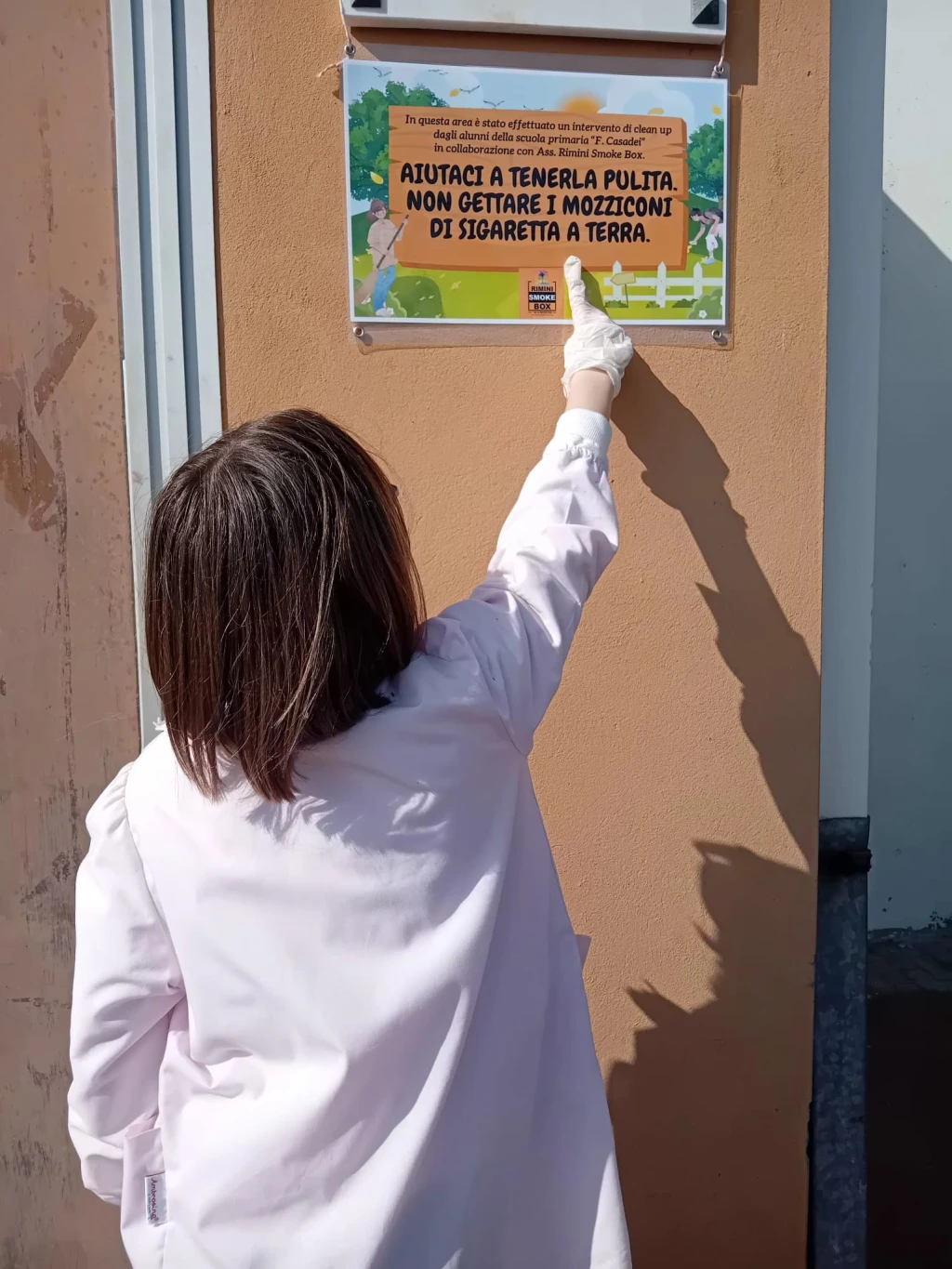 Ma l’azione non si è esaurita con la sola raccolta. Per lasciare un segno indelebile della loro determinazione e per ammonire chi ha sporcato, durante l’evento i bambini hanno anche affisso dei cartelli esplicativi sull’importanza del rispetto dell’ambiente. Uno di questi cartelli è stato realizzato in collaborazione con noi e installato sotto la targa della Palestra Valter Rinaldi. È un appello diretto, un monito potente che recita a chiare lettere: “AIUTACI A TENERLA PULITA. NON GETTARE I MOZZICONI DI SIGARETTA A TERRA.” Questo cartello non è solo un messaggio; è l’invito accorato di un gruppo di bambini che non accetta di ereditare un mondo sporco.