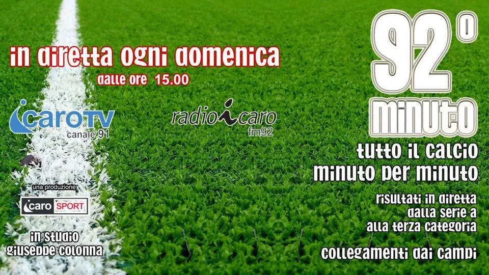 Torna la ricca domenica di calcio su Icaro TV (canale 91) e Radio Icaro (92FM). Dal 13 settembre in diretta dalle 15 “92° minuto”, tutto il calcio del nostro territorio minuto per minuto, con i risultati in tempo reale dalla serie A alla Terza Categoria ed i collegamenti con i nostri inviati dai campi. Conduce Giuseppe Colonna.