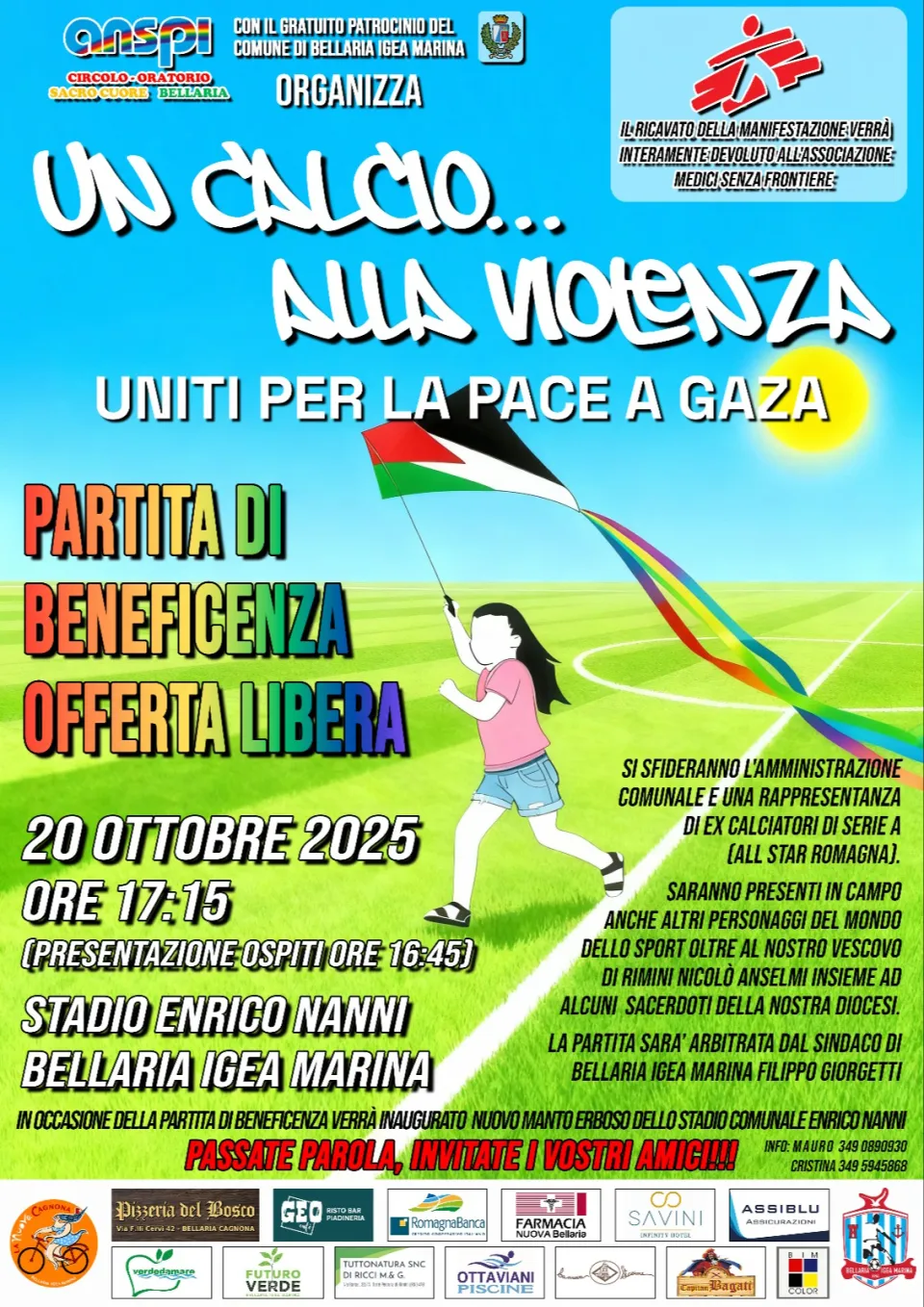 Una manifestazione benefica a cui tutti sono invitati ad assistere ed il cui ricavato – l’ingresso è a offerta libera – verrà interamente devoluto all’associazione Medici Senza Frontiere per sostenere la popolazione civile palestinese. Sul campo, si sfideranno da un lato una squadra composta da esponenti dell’Amministrazione, dipendenti comunali, amici e semplici appassionati, dall’altro una rappresentanza di ‘vecchie glorie’ romagnole che con generosità hanno sposato la causa promossa da Anspi: fischietto d’eccezione, il primo cittadino Filippo Giorgetti nelle vesti di arbitro. Non mancheranno le sorprese, nonchè la già annunciata, presenza di altri volti noti dello spettacolo e dello sport, non solo del mondo calcistico, nonchè quella del Vescovo di Rimini, Sua Eccellenza Monsignor Nicolò Anselmi. La partita sarà inoltre l’occasione per inaugurare ufficialmente il nuovo manto dello stadio di recente completamento.