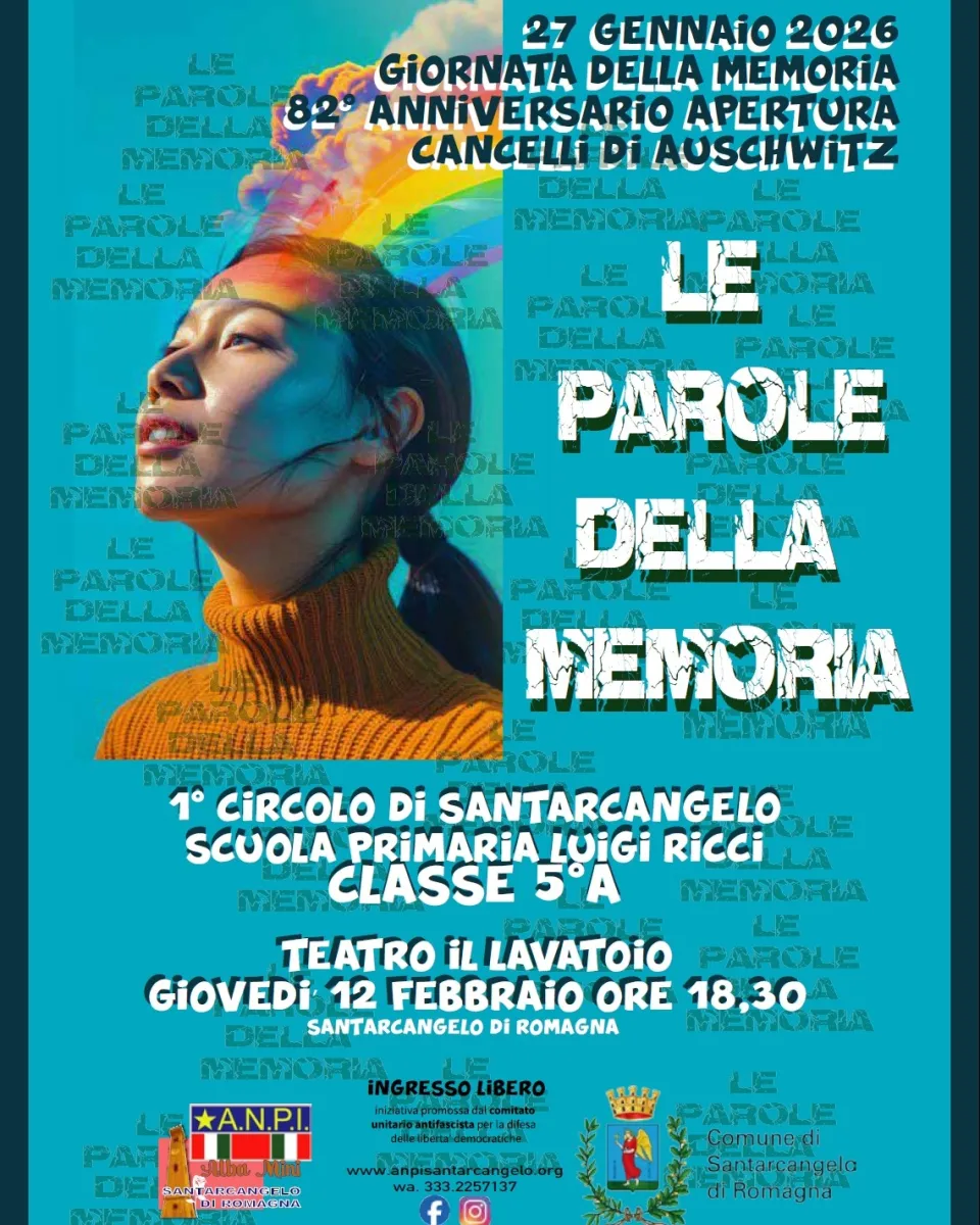 Alle ore 18,30 di giovedì 12 febbraio il Teatro Lavatoio ospita l’evento “Le Parole della Memoria”, realizzato dalla classe 5º A della scuola primaria “Luigi Ricci” di San Vito: l’iniziativa nasce dalla volontà di insegnanti e studenti di raccontare e riflettere, attraverso gli occhi dei bambini, sulle parole che ci raccontano come la diversità e il rifiuto di essa abbia portato alle tragiche conseguenze dei campi di sterminio. L’iniziativa è promossa dall’ANPI “A. Mini” Santarcangelo e dal Comitato cittadino antifascista di Santarcangelo.