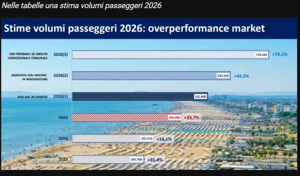 Con i voli già in vendita, AIRiminum stima un 2026 da oltre mezzo milione di passeggeri (531.800 per l'esattezza) con un +23,7% sul 2025. Se andranno in porto i voli attualmente in fase di negoziazione il numero dovrebbe salire a circa 620.000 e se, infine, ci sarà il via libera all'abolizione dell'addizionale municipale si potrebbe arrivare a 770.000.
