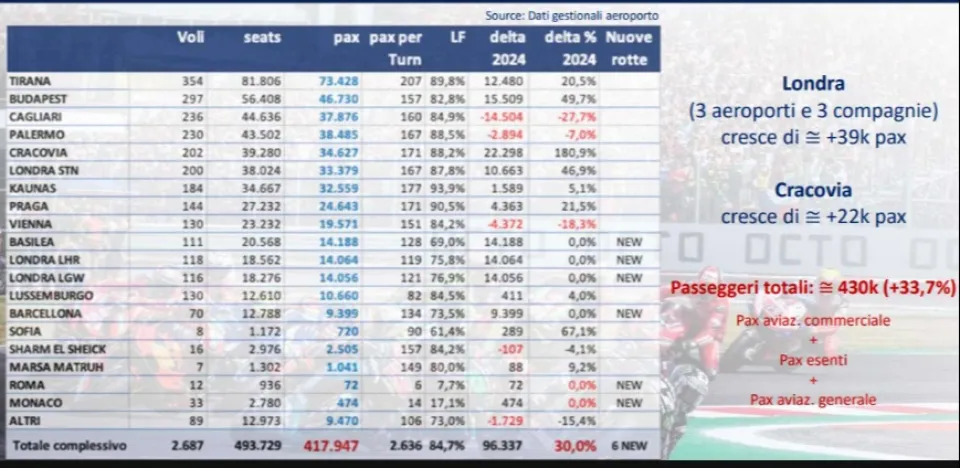 Per quanto riguarda il 2025, attualmente i passeggeri transitati dal Fellini sono stati 417.000 con una crescita del 30% sul 2024. Buona la percentuale di riempimento, che ha sfiorato l'85%. Kaunas e Praga hanno superato il 90% mentre sono stati un flop i voli organizzati da IEG per le grandi fiere con Roma ferma al 7,7% di riempimento e Monaco al 17,1%. La crescita più consistente ha riguardato invece Londra con 66mila passeggeri su tre destinazioni (+170%) e Cracovia con 34.600 (+180%).