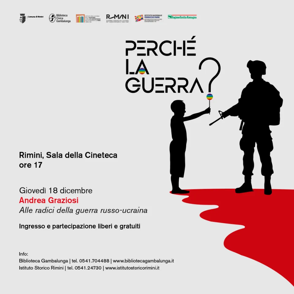 Ultimo appuntamento della rassegna “Perché la guerra?” con la conferenza Alle radici della guerra russo-ucraina dello storico Andrea Graziosi, professore di Storia contemporanea all’Università di Napoli Federico II), con cui ci si interrogherà sulle ragioni dell’attacco militare di Putin all’Ucraina. La conferenza è in programma giovedì 18 dicembre alle 17 nella Sala della Cineteca.