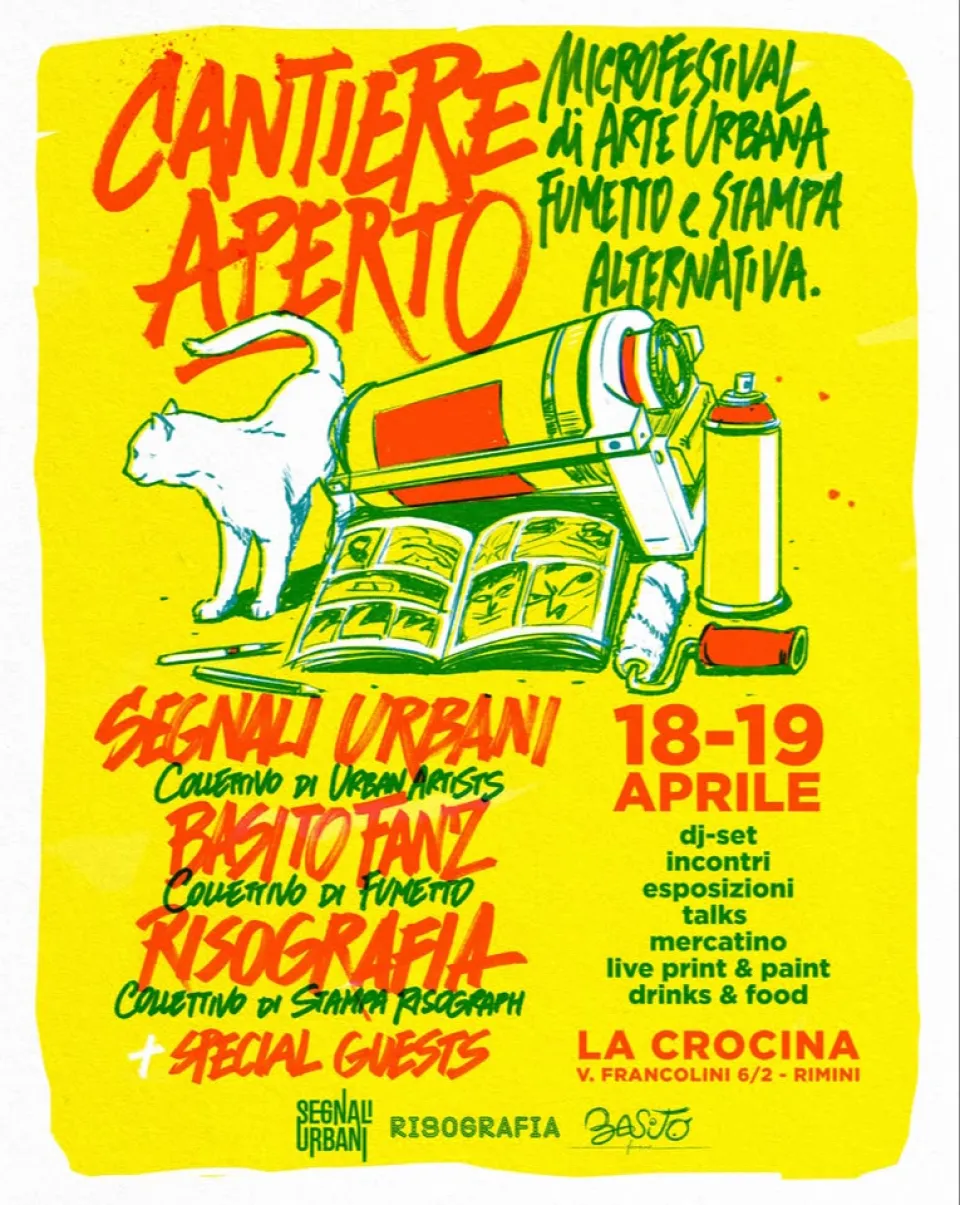 Nello spazio "La Crocina" in via Francolini 6 a Rimini (l'area del palazzo Lettimi) sabato e domenica si svolge "Cantiere Aperto", micro festival di arte urbana, illustrazione, fumetto e stampa alternativa.