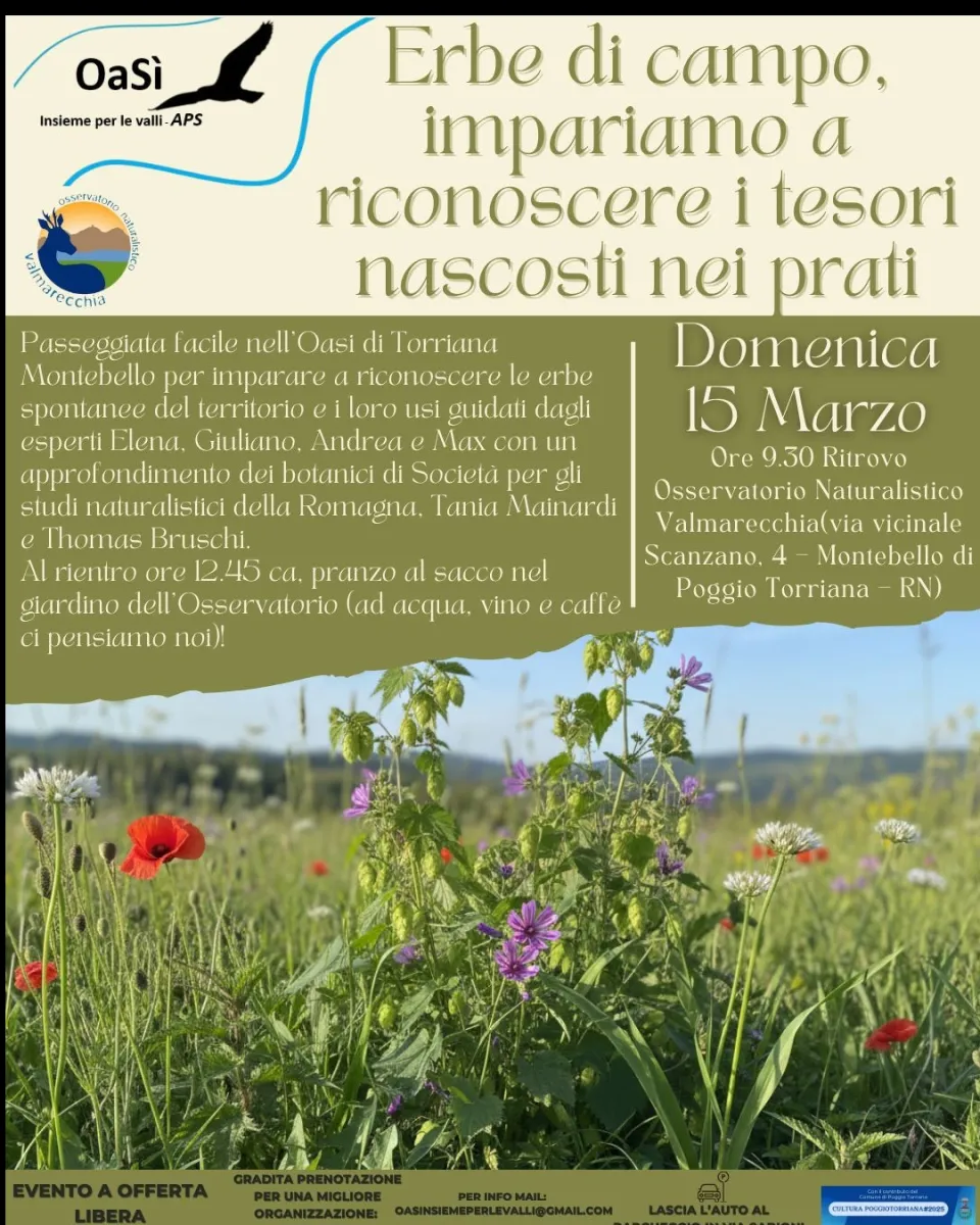 Domenica 15 marzo all'Osservatorio Naturalistico Valmarecchia di Montebello (via Vicinale Scanzano n. 4 – Poggio Torriana) alle ore 9.30 è in programma l'evento "Erbe di campo. Impariamo a riconoscere i tesori nascosti nei prati" promosso dall'associazione "OaSì". Una camminata tra i prati di Montebello per imparare a riconoscere le erbe spontanee “mangerecce”, scoprendo curiosità, proprietà e antichi usi, guidati dagli esperti Elena, Giuliano, Massimiliano e Andrea.
