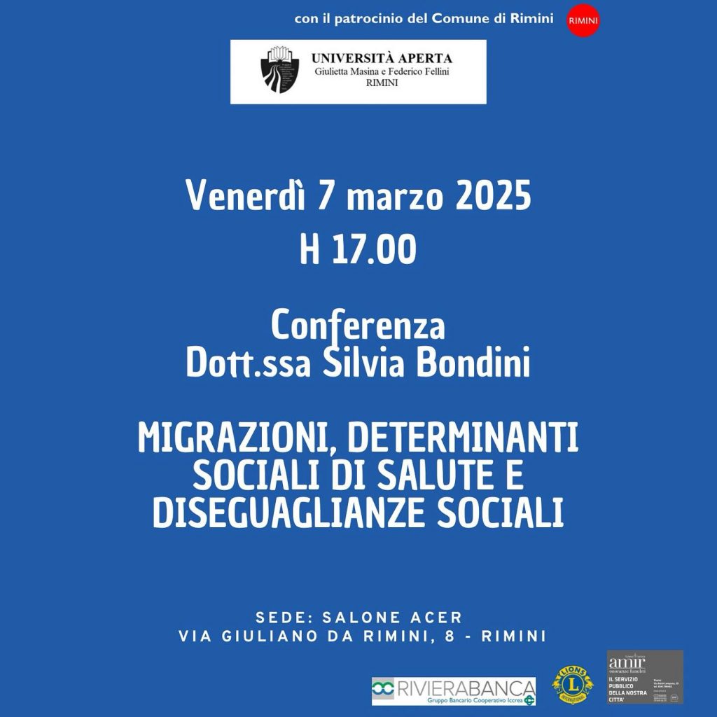 La conferenza “Migrazioni, determinanti sociali di salute e diseguaglianze sociali”, organizzata da Università Aperta “Giulietta Masina e Federico Fellini”, si terrà venerdì 7 marzo alle ore 17 presso il Salone ACER (via Giuliano da Rimini, 8 – Rimini).