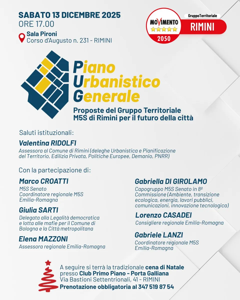 Il Movimento 5 Stelle di Rimini organizza per sabato 13 dicembre alle 17 alla Sala Pironi in Corso d'Augusto 231 a Rimini un incontro dal titolo "Piano Urbanistico Generale. Proposte del gruppo territoriale M5S di Rimini per il futuro della città". Previsto un saluto iniziale dell'assessora all'Urbanistica del Comune di Rimini Valentina Ridolfi e poi gli interventi dell’assessora regionale dell’Emilia Romagna Elena Mazzoni, la delegata alla legalità democratica del Comune di Bologna e della Città metropolitana Giulia Sarti; il consigliere regionale dell’Emilia-Romagna Lorenzo Casadei e la senatrice e capogruppo 5S in commissione ambiente Gabriella Di Girolamo oltre ai coordinatori regionali Marco Croatti e Gabriele Lanzi.