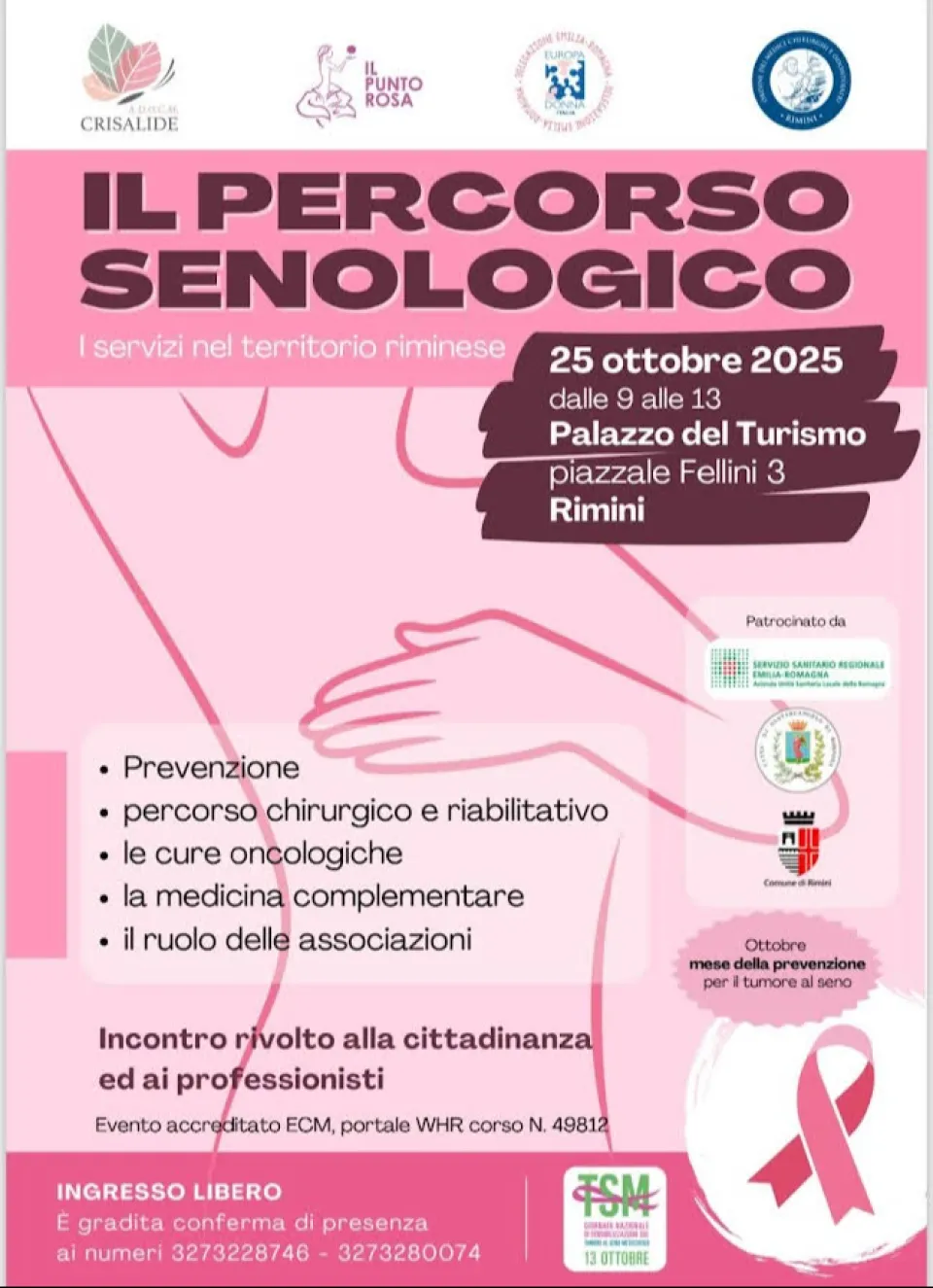 Sabato dalle 9 alle 13 al Palazzo del Turismo in piazzale Fellini a Rimini si terrà il convegno, aperto a professionisti e cittadinanza, "Il percorso senologico. I servizi del territorio riminese". Il convegno è promosso da un gruppo di associazioni a sostegno delle donne pazienti di tumore col patrocinio dei comun di Rimini e Santarcangelo e Ausl. Tra i relatori, i professionisti della breast unit di Rimini. L'iniziativa rientra nell'ambito del mese della prevenzione del tumore al seno.