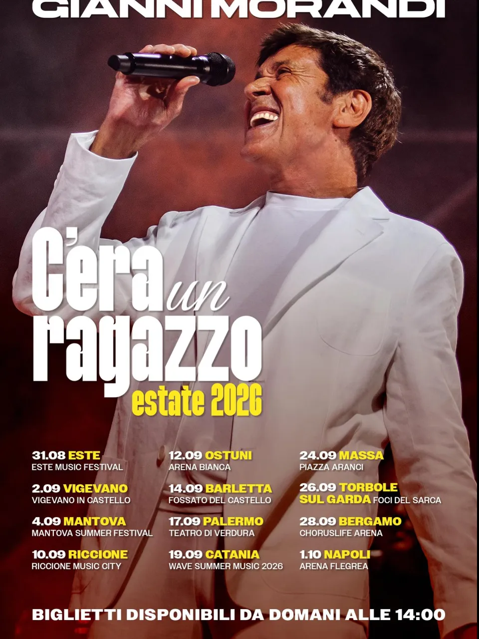 Gianni Morandi farà tappa a Riccione, il 10 settembre, nell’ambito di «Riccione Music City»: la rassegna di concerti estivi a pagamento in piazzale Roma. L'evento riccionese rientra nel nuovo tour 'C’era un ragazzo estate 2026' annunciato dall'artista di Monghidoro. I biglietti saranno in vendita sui circuiti Ticketone e Ticketmaster da martedì 28 aprile.