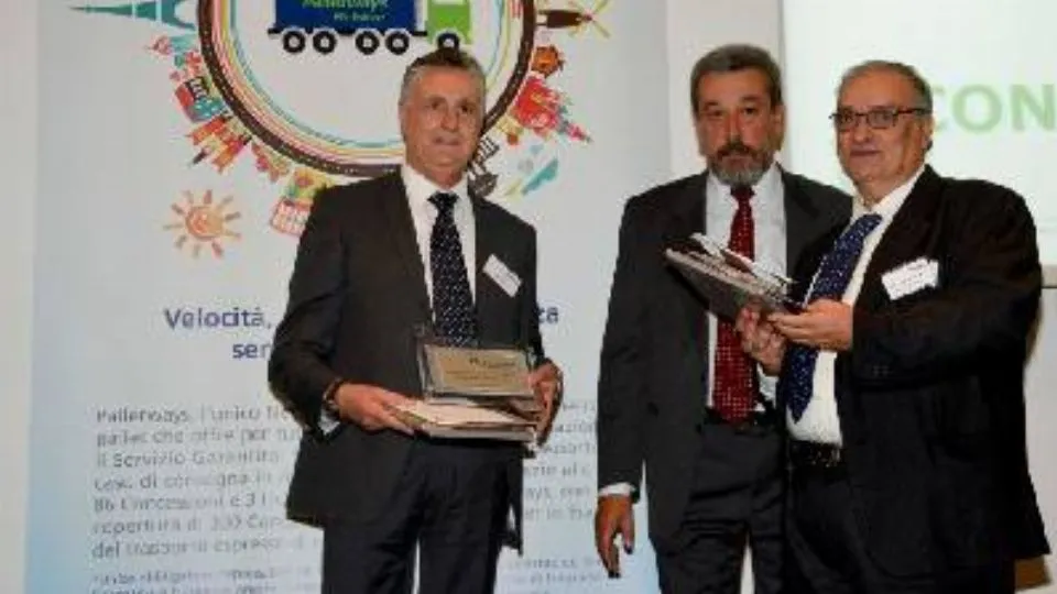 Il premio è stato consegnato a Maurizio Maestri (a sinistra), titolare di S.M. LOGISTICA SRL, da Albino Quaglia (al centro), amministratore delegato di Palletways Italia, nell’ambito della Convention annuale di Palletways che si è tenuta a Rimini. A destra, Giovanni Di Maggio, dirigente di FUTURA ENTERPRISE, azienda di Bari, che ha vinto il riconoscimento a peri merito con S.M. LOGISTICA SRL.