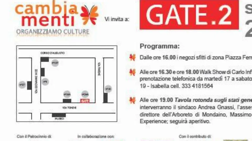 ore 16.30 e ore 18.00: Walk Show di Carlo Infante (Urban Experience); durata 30 min. circa; su prenotazione telefonica*; hashtag per twitter e instagram: #gate2 #cambiamenti #urbexp #insiemefuoridalfango