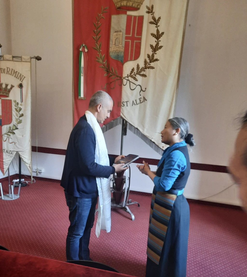 Il Sindaco Sadegholvaad ha omaggiato la Sig.ra Thinley Chukky e la delegazione tibetana con una medaglia commemorativa del Bimillenario dell'Arco d'Augusto, simbolo identitario della storia e della romanità di Rimini, accompagnata da un volume dedicato alla Romagna, quale segno di appartenenza e orgoglio per la propria terra.