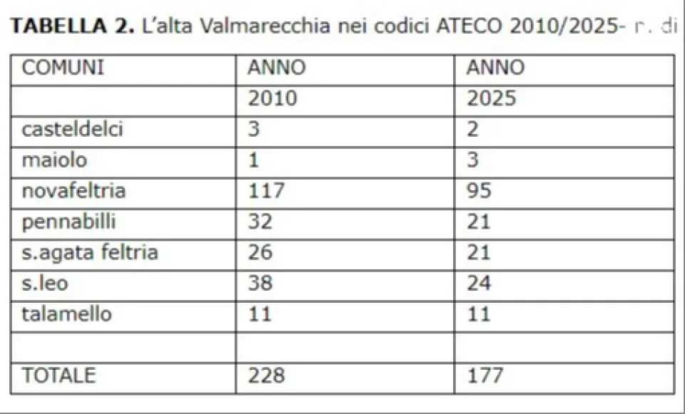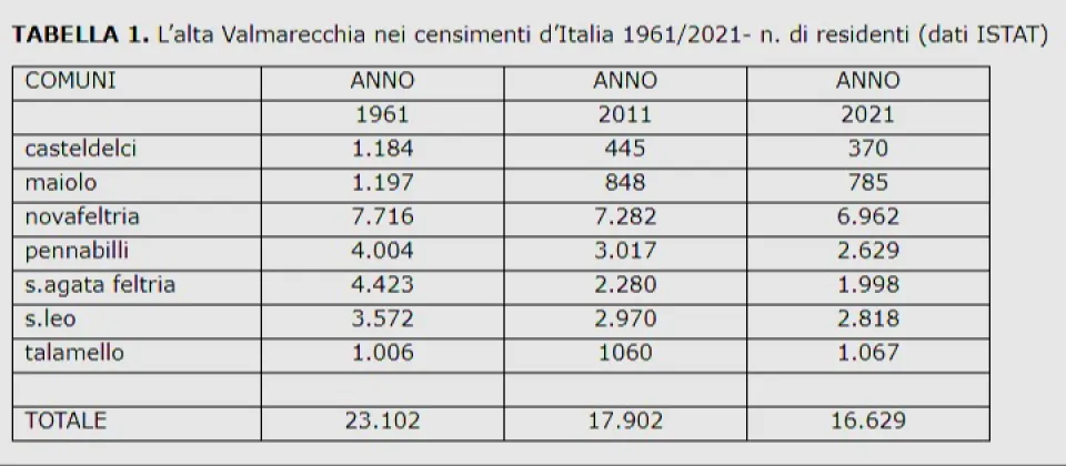 Nel giro di cinquanta anni, tra il 1961 e il 2021, l'Alta Valmarecchia ha perso un terzo della popolazione: da 23.100 a 16.200 abitanti. I casi più eclatanti Sant'Agata Feltria, che ne ha persi oltre la metà, e Casteldelci, che si è ridotta a un terzo.