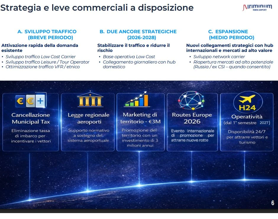 Per arrivare al risultato, evidenzia AIRiminum, serve il coinvolgimento coordinato di istituzioni, territorio e operatori economici. Per questo la società di gestione del Fellini ha impostato una strategia per rafforzare la capacità infrastrutturale, la struttura societaria e la competitività e attrattività della destinazione. Fondamentale in questo senso l'eliminazione della municipal tax decisa dalla Regione per gli scali minori (Rimini, Forlì e Parma) e la nuova legge regionale di sistema a cui si aggiungono il piano di marketing territoriale, la Routes Europe 2026 che vedrà Rimini diventare nel prossimo maggio il "centro" del mondo aeroportuale internazionale, e l'operatività H24 dello scalo a partire dal primo semestre del prossimo anno (2027).