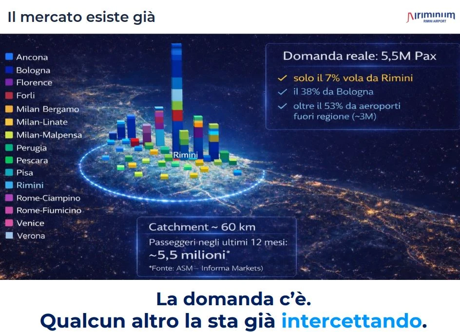 Punto di partenza del percorso la constatazione che la domanda esiste già, forte e strutturata, ma deve essere intercettata. Il bacino dell’aeroporto di Rimini (in un raggio di 60 km) esprime infatti 5,5 milioni di passeggeri annui, ma ad oggi solo una quota marginale utilizza il Fellini (7%) e se una parte vola da Bologna ci sono ben 3 milioni di persone che si spostano verso scali fuori regione. L'obiettivo quindi è intercettare una mobilità già esistente e consolidare in maniera stabile il valore sul territorio in termini di flussi turistici, investimenti e conseguenti ricadute economiche. Nessuna competizione col Marconi di Bologna, ma Rimini come secondo pilastro di un sistema regionale che porti ad una crescita più equilibrata, efficiente e sostenibile.