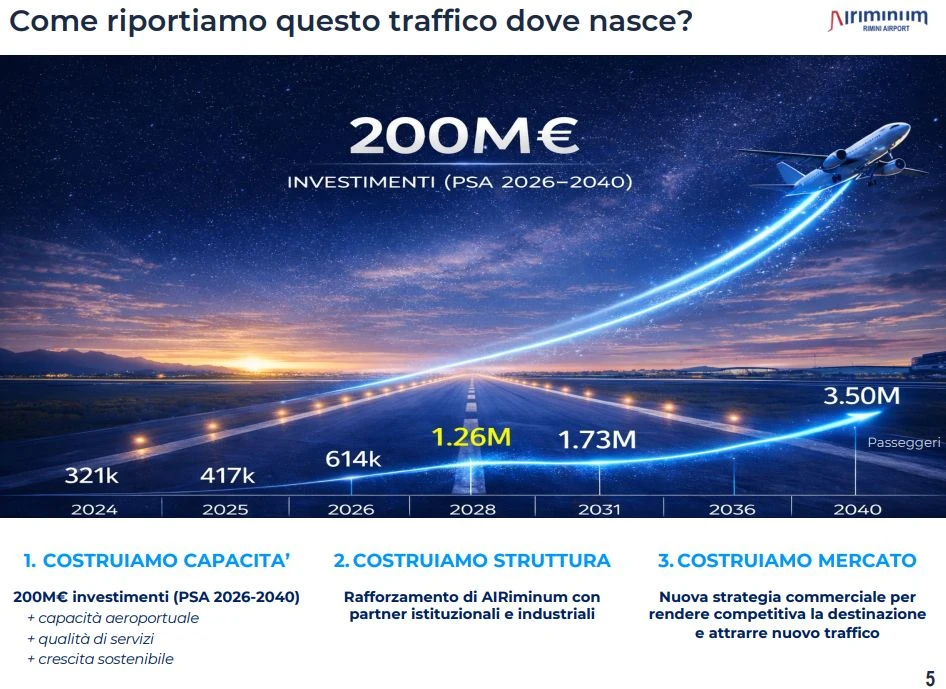 In termini di passeggeri, le stime per il Fellini prevedono di chiudere il 2026 a quota 614mila dopo i 417mila del 2025. Il superamento del milione potrebbe arrivare nel 2028 con una base low cost ed un collegamento giornaliero con un hub domestico.
