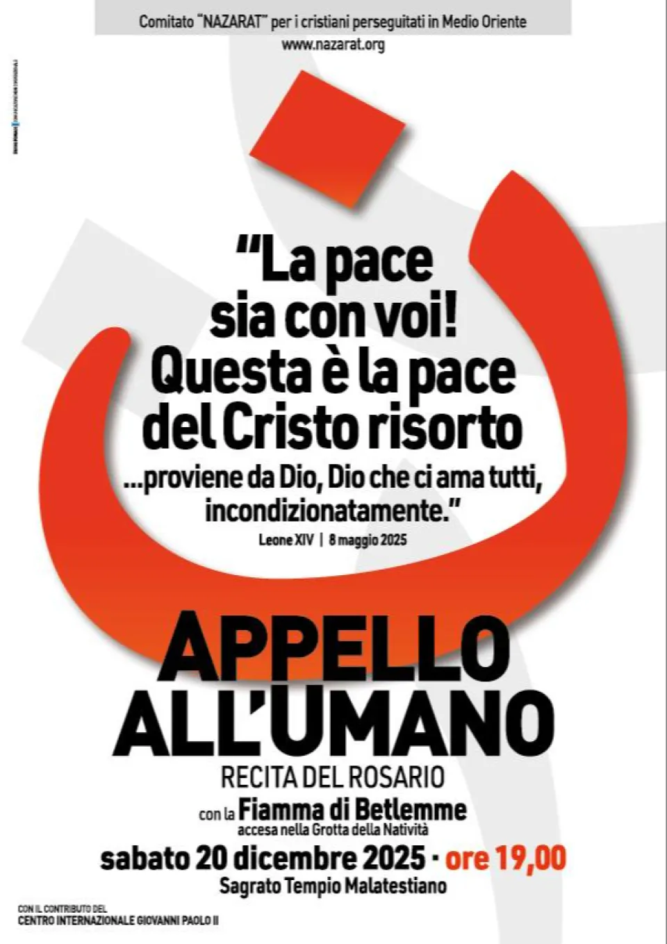 "L’Appello all’umano" di sabato 20 dicembre propone alcune novità. L’appuntamento solidale di preghiera a favore dei fratelli perseguitati e per la pace cambia, solo per dicembre, orario e posto. Sarà infatti sul sagrato della chiesa cattedrale di Rimini alle ore 19. Resta invece la consuetudine di ospitare la Fiamma di Betlemme. Saranno accesi lumini a questa fiamma, simbolo della luce del Natale di Cristo, che arriva dalla Terra Santa.
