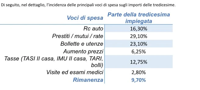 Secondo lo studio solo il 9,7% del monte tredicesime rimarrà nelle tasche delle famiglie per regali, pranzi, cenoni ed eventuali viaggi. Gran parte degli importi delle tredicesime è destinato, invece, ai rincari delle assicurazioni (la cui incidenza sulle tredicesime ammonta al 16,3%), nonché alle rate di mutui e prestiti, voce da sempre in testa alla classifica delle componenti che intaccano la gratifica natalizia, la cui incidenza quest’anno è pari al 29,1%.
