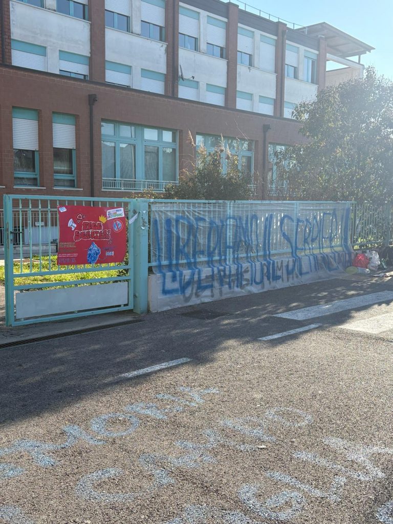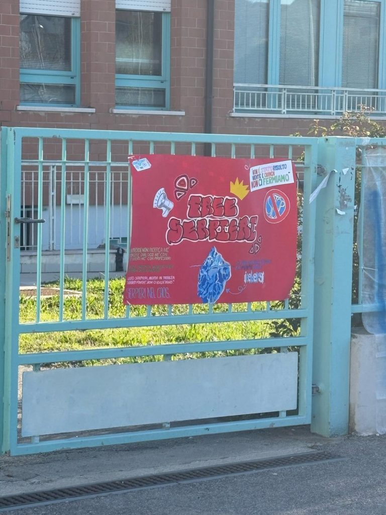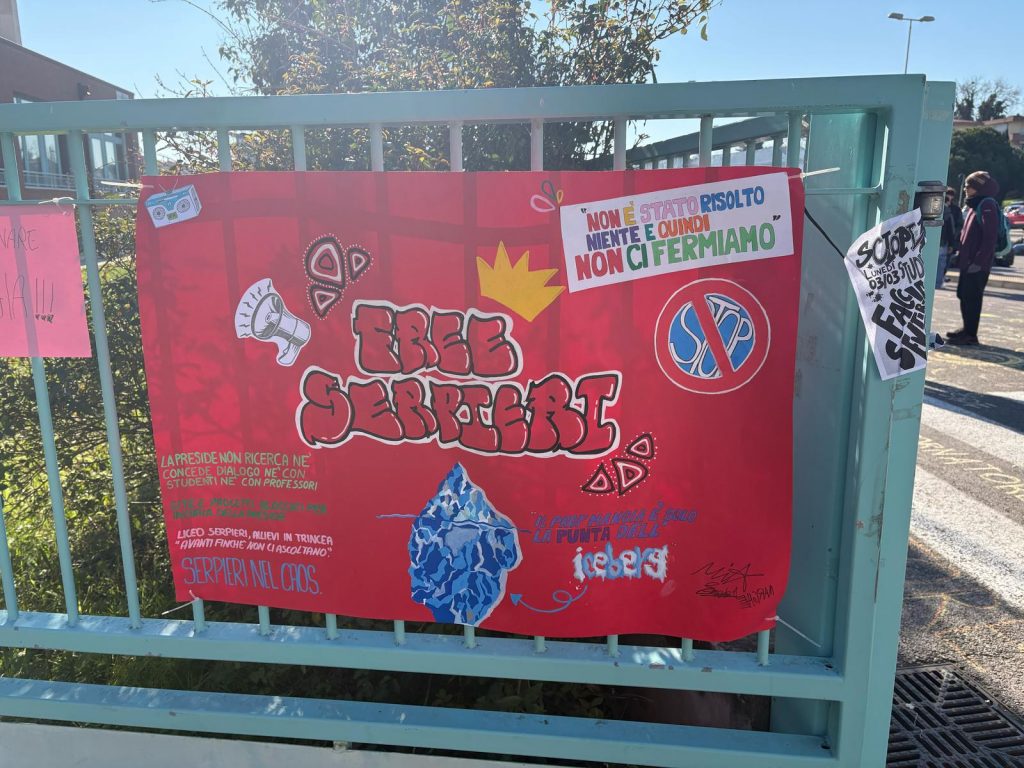 Ma i malumori hanno continuato a covare, tanto da spingere un numeroso gruppo di docenti del Liceo a denunciare pubblicamente la preoccupazione per il calo delle iscrizioni ma anche per la mancata approvazione del “Programma Annuale” del 2025 da parte del Consiglio di Istituto. Era poi seguita la sospensione di due insegnanti per vicende relative ai primi mesi dell’anno scolastico, una prima protesta degli studenti che erano entrati a scuola ma non in aula e un sit-in di genitori, docenti e genitori davanti alla dell’Ufficio Scolastico. Questa mattina la mobilitazione è diventata uno sciopero a cui hanno partecipato un significativo numero di ragazzi. Gli studenti hanno appeso cartelli e striscioni sui cancelli della scuola con lo slogan “liberiamo il Serpieri” e “Serpieri Free” e hanno disegnato a terra con dei gessetti il loro dissenso per la situazione che mette a rischio la serenità del loro percorso scolastico.