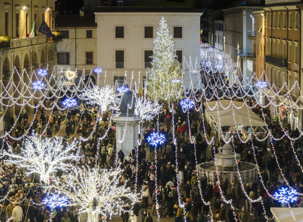 Piazza Cavour sarà così illuminata da un "cielo di luci aeree" impreziosito da lampadari scenografici e grandi installazioni luminose a terra, che faranno risplendere l'albero di Natale centrale, mentre l'ingresso alla città all'Arco d'Augusto sarà valorizzato da un imponente allestimento scenografico della Natività. In Piazza Tre Martiri arriva l'albero di Natale alto 18 metri, mentre la luce avvolgerà i monumenti e i luoghi simbolo della città. Ritorna la cascata luminosa sul grande Platano accanto al Teatro Galli, e le luci illumineranno le alberature in Piazza Malatesta e la scalinata dell'Arena Francesca da Rimini.