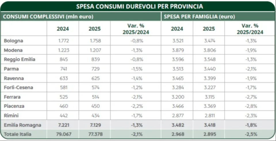 Nel 2025 la spesa per beni durevoli in Emilia-Romagna si è attestata a 7,12 miliardi di euro, quarta in Italia, in calo dell’1,3% rispetto all’anno precedente. Fanalino di coda in Regione e 61esima nel Paese, è la provincia di Rimini con 433,8 milioni (-1,7%). A livello nazionale il calo è stato del 2,1%. E' quanto emerge dall'Osservatorio Annuale Consumi di Findomestic, giunto alla 32° edizione.