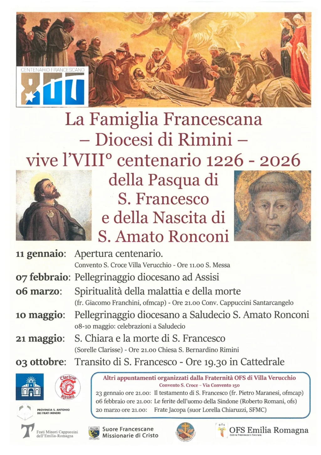 Ha visto riunite le famiglie francescane della Diocesi di Rimini la Messa di apertura, nel Convento di Villa Verucchio, dell'Anno Giubilare in commemorazione dell’ottavo centenario del transito di San Francesco d’Assisi. Papa Leone XIV ha stabilito infatti che dal 10 gennaio 2026 al 10 gennaio 2027 si celebri questo Anno di San Francesco durante il quale tutti i fedeli cristiani sono invitati a seguire l’esempio del Santo di Assisi, diventando modelli di santità di vita e testimoni instancabili di pace. La Penitenzieria Apostolica concede l’indulgenza plenaria, alle consuete condizioni, a quanti parteciperanno devotamente a questo Giubileo che rappresenta un’ideale continuazione di quello Ordinario del 2025. Il prossimo appuntamento è in programma il 7 febbraio con il pellegrinaggio diocesano ad Assisi.