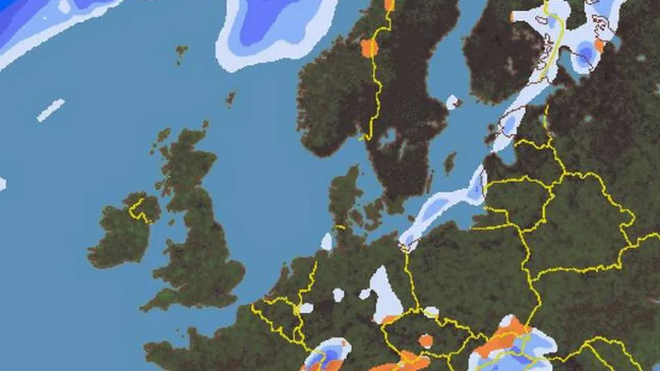 Nell’immagine: Precipitazioni tra venerdì 15 e sabato 16 (blu/verde = forti).