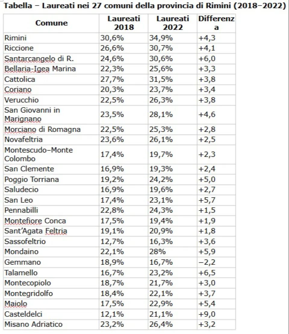 Il 24 gennaio si celebra la Giornata internazionale dell’educazione, istituita dall’Onu per richiamare l’attenzione sul ruolo centrale dell’istruzione nello sviluppo, nella coesione sociale e nella riduzione delle disuguaglianze. Secondo un’elaborazione Openpolis su dati Istat l’intera provincia di Rimini registra un aumento significativo della popolazione laureata tra il 2018 e il 2022. Guidano la crescita Casteldelci (+9 punti), Talamello (+6,5), Santarcangelo di Romagna (+6) e Mondaino (+5,9), mentre solo Gemmano registra un lieve calo, influenzato anche da dinamiche demografiche.
