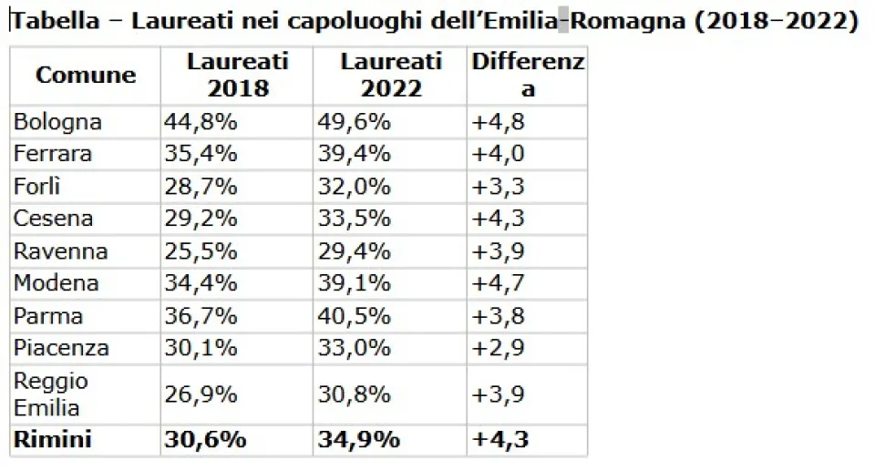 Nel confronto con gli altri capoluoghi dell’Emilia‑Romagna, Rimini si distingue per una delle crescite più elevate. Con un aumento di +4,3 punti percentuali, il capoluogo supera città con una presenza universitaria più antica, come Parma, Ferrara, Reggio Emilia, e province come Ravenna, Piacenza e Forlì, collocandosi tra i territori più dinamici della regione.