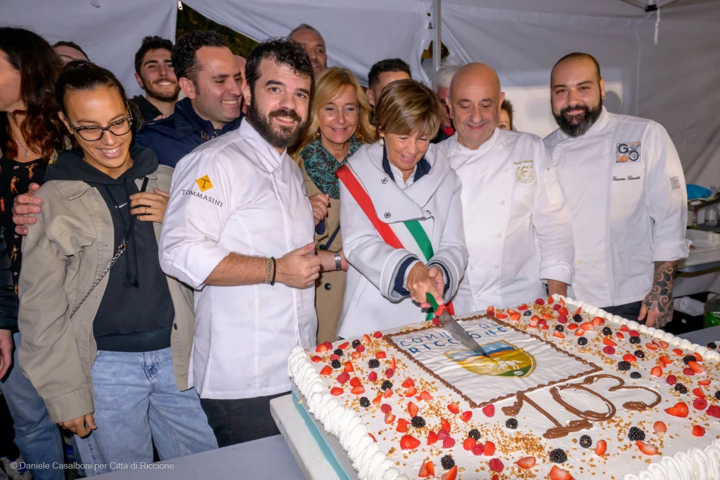 Nel tardo pomeriggio la festa si è spostata in piazza Unità, dove si è tenuto il taglio della torta celebrativa, firmata dai maestri pasticceri Staccoli, Tommasini e Ciavatta, alla presenza della sindaca Daniela Angelini, dell’Amministrazione comunale e del Comitato organizzatore di “CiocoPaese” - Riccione Paese - rappresentato dalla presidente Lina Danese.