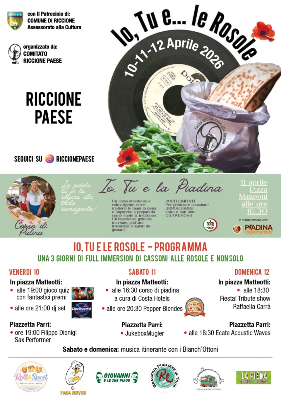 A fare da cornice, “Io, tu e… le rosole”, un percorso gastronomico dedicato ai sapori semplici e genuini della cucina locale tra musica dal vivo e iniziative diffuse a Riccione Paese.