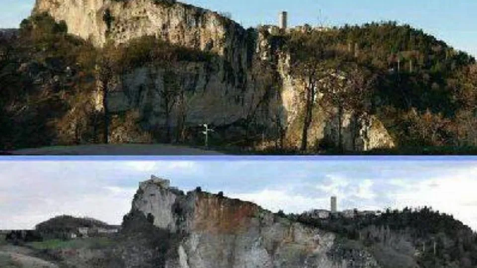 (San Leo prima e dopo il crollo nella foto tratta dalla pagina Facebook dell’assessore provinciale Galasso)
