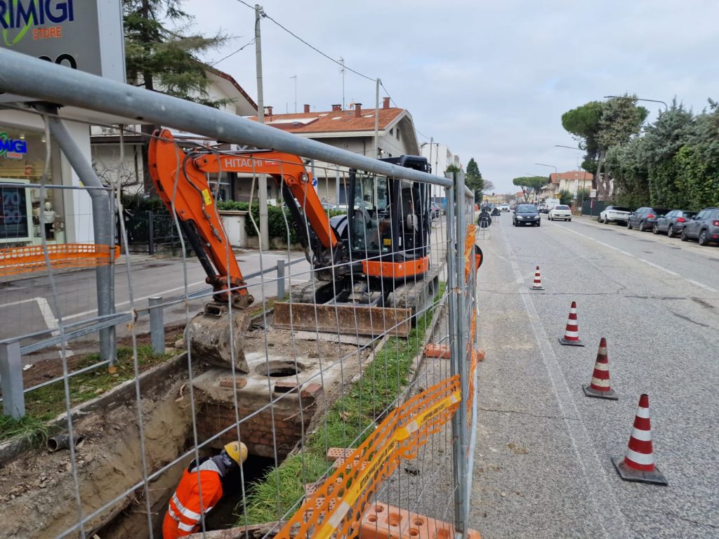 La rottura di una grossa condotta in cemento del diametro di 80 centimetri ha causato un cedimento del marciapiede in via Adriatica, all’altezza del civico 52 a Riccione. Le squadre di pronto intervento di Hera sono immediatamente intervenute sul posto per isolare l’area e avviare le operazioni di riparazione. L’azienda stima che l’intervento si concluda entro domani sera.
