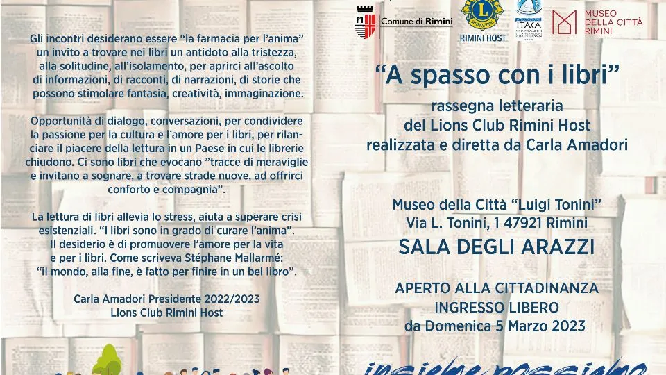Torna la rassegna letteraria di Lions Club Rimini Host e Associazione Itaca “A spasso con i libri”, realizzata e diretta da Carla Amadori, in collaborazione con il Museo della Città di Rimini e con il patrocinio del Comune di Rimini.