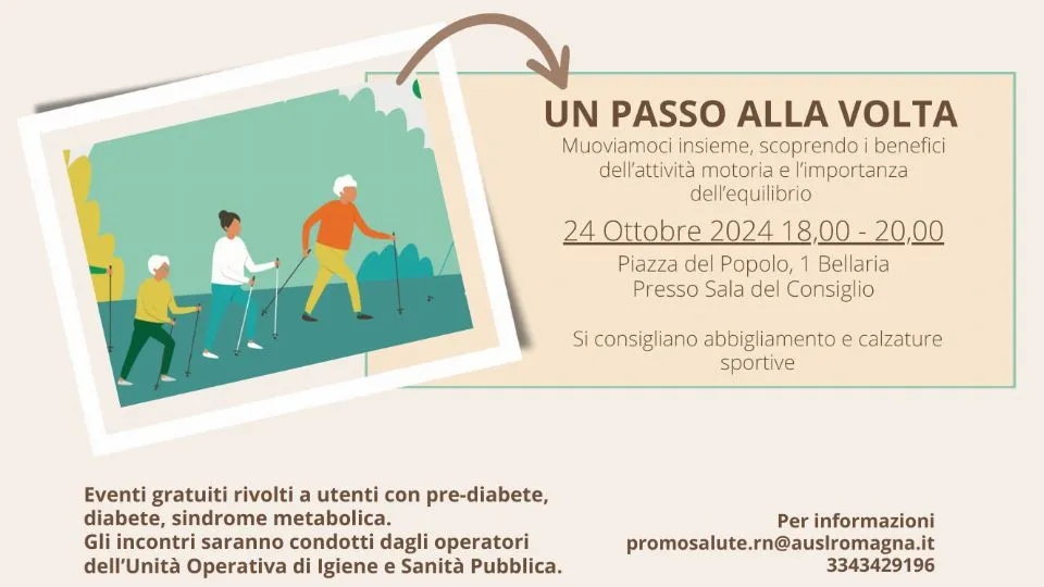 Giovedì 24 ottobre, nella sala del Consiglio Comunale di Bellaria Igea Marina (Piazza del Popolo 1), si svolgerà dalle ore 18 alle 20 “Un passo alla volta”, l’iniziativa gratuita finalizzata a far conoscere i benefici dell’attività fisica e le opportunità che i parchi cittadini offrono per fare movimento.