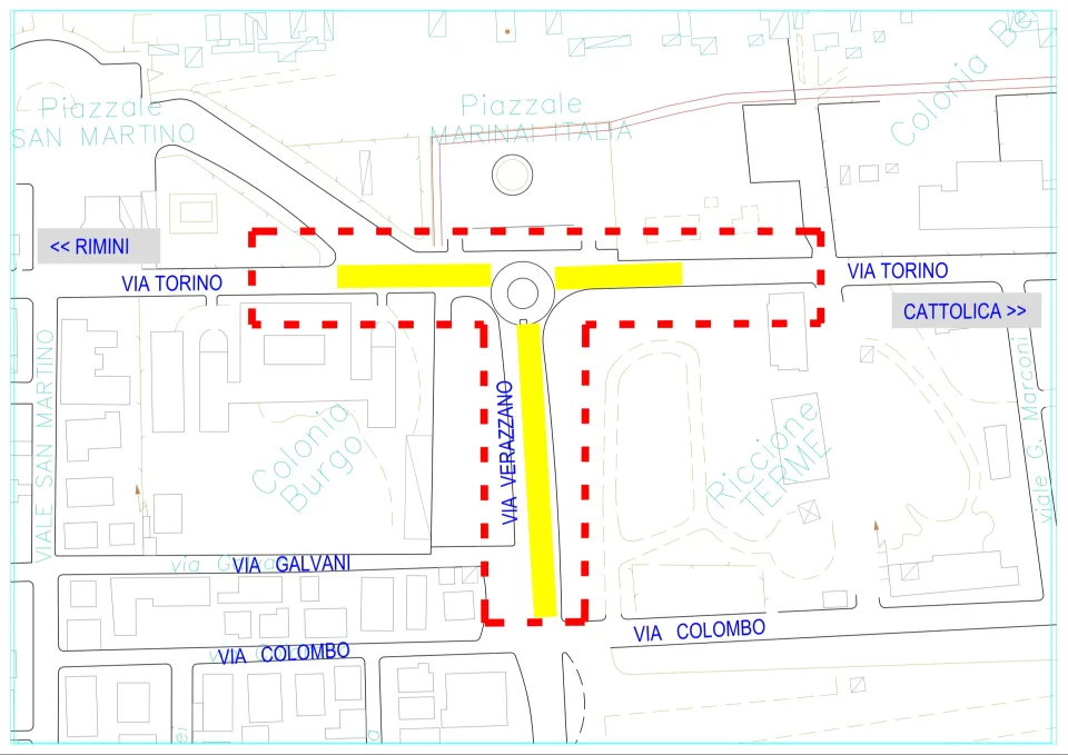 Le strade interessate saranno viale Torino, nella corsia lato monte da viale Da Verrazzano, per un tratto di circa 50 metri direzione Rimini e direzione Cattolica con corsia lato mare regolata da impianto semaforico; sarà inoltre interessata dalle modifiche viale Da Verazzano all’intersezione con viale Colombo fino a viale Torino.